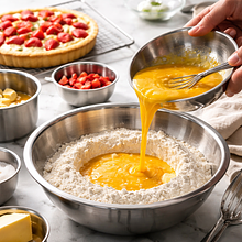 Przygotuj składniki na spód. Wyjmij masło z lodówki na 5-10 minut przed pracą, ma pozostać zimne, ale lekko giving przy naciśnięciu. Przesiej mąkę do dużej miski, dodaj cukier puder, sól i proszek do pieczenia. Wymieszaj suche składniki drewnianą łyżką, aby równomiernie się rozprowadziły.