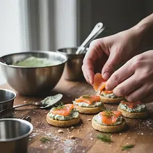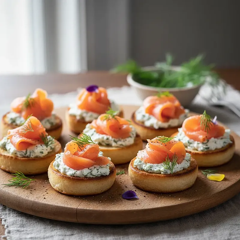 Eleganckie, błyskawiczne w przygotowaniu i niezwykle smaczne mini kanapki, znane również jako kanapki bankietowe lub canapés. To klasyczna przystawka, która idealnie sprawdza się na przyjęciach, zwłaszcza podczas Sylwestra, karnawału czy spotkań w gronie przyjaciół. Połączenie intensywnego smaku ciemnego, lekko słodkawego pumpernikla z kremowym, delikatnie kwaskowatym serkiem z nutą świeżego koperku i cytryny, a wszystko zwieńczone aksamitnym, wędzonym na zimno łososiem. Kontrast kolorów – głęboki brąz chleba, biel serka, róż łososia i zieleń koperku – sprawia, że kanapki prezentują się zjawiskowo na każdym stole. Są to kąski na jeden raz, co czyni je bardzo wygodną formą przekąski.