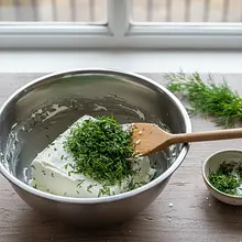 Przygotuj świeże zioła i cytrynę. Dokładnie umyj pęczek koperku pod bieżącą, zimną wodą, a następnie osusz go delikatnie ręcznikiem papierowym. Oddziel grubsze łodygi, a delikatne gałązki posiekaj bardzo drobno ostrym nożem. Cytrynę dokładnie wyszoruj szczoteczką pod gorącą wodą, a następnie osusz. Zetrzyj skórkę z połowy cytryny na tarce o drobnych oczkach (tylko żółtą część, biała jest gorzka). Z tej samej połówki wyciśnij sok, około 1 łyżki stołowej (15 ml).