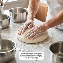 Wyłóż ciasto na lekko oprószony mąką blat i zacznij wyrabiać ręcznie przez 8–10 minut: ugniataj pięścią, składaj i przesuwaj ciasto, aż stanie się gładkie, elastyczne i przestanie mocno kleić się do rąk. Jeśli masz mikser z hakiem do ciasta, wyrabiaj 5–7 minut na niskich obrotach.