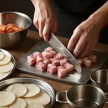 Użyj dwóch widelców lub dwóch sztućców do rozrywania mięsa; nie używaj noża do tworzenia mikroskopijnych kawałków — lepsza jest struktura.