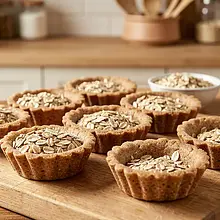 Delikatne mini tarty łączą kwaskowaty, sezonowy rabarbar z lekkim kremem na bazie jogurtu naturalnego — wersja fit i wiosenna idealna na przyjęcia sylwestrowe w zdrowym stylu. Spód przygotowany z mąki pełnoziarnistej i płatków owsianych daje przyjemną strukturę i niższą ilość przetworzonych węglowodanów niż klasyczne kruche ciasto, a odrobina masła i jajka scala ciasto, nie dominując smaku. Rabarbar duszony z niewielką ilością cukru i skrobią zachowuje soczystość i lekko kwaśny charakter, który świetnie kontrastuje ze słodko-kremowym jogurtem zagęszczonym agar-agar. Tarty wyglądają efektownie — małe porcje, pastelowy róż rabarbaru i biały krem — i nadają się na eleganckie przyjęcie lub jako zdrowy deser po obfitym posiłku. Podawać schłodzone, można udekorować świeżą miętą i skórką cytrynową dla dodatkowego aromatu.