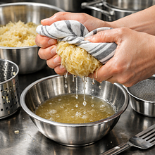 Odsącz nadmiar wody: przełóż startą masę ziemniaczano-cebulową na czystą ściereczkę kuchenną lub gazę. Złóż ściereczkę nad masą i mocno wyciśnij płyn nad miską — dociskaj oboma dłońmi, aż zostanie dużo mniej wilgoci. Alternatywnie: odstaw startą masę w misce na 5–10 minut — płyn opadnie na dno; odlej wodę i zachowaj osad skrobiowy (jeśli chcesz, dodaj go później do masy jako naturalne zagęstnienie).