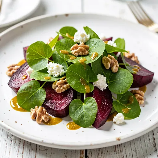 Lekka, wiosenna sałatka łącząca kwasowy szczaw, słodkawy pieczony burak i kremowy ser kozi — idealna jako fit przystawka na Sylwestra lub lekka kolacja. Danie bazuje na sezonowych polskich składnikach: młody szczaw dodaje świeżości i przyjemnej kwaskowatości, pieczony burak wnosi ziemistą słodycz i ładny kolor, a ser kozi kontrastuje kremową strukturą. Sałatkę warto podać z prostym winegretem na oleju rzepakowym i soku z cytryny; dla urozmaicenia można dodać prażone orzechy włoskie lub szybki, lekko kwaskowy rabarbar. Potrawa ma atrakcyjną wizualnie kompozycję — zielone liście, bordo burak i białe kawałki sera — oraz zbalansowane smaki: kwas, słodycz i tłustość.