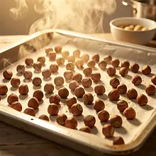 Rozgrzej piekarnik do 180°C (termoobieg 170°C). Rozłóż orzech laskowy równomiernie na blasze wyłożonej papierem do pieczenia, tak aby się nie nakładały. Wstaw do nagrzanego piekarnika i praż 8-10 minut — obserwuj: orzechy powinny być złociste, skórka zacznie pękać i pojawi się intensywny, orzechowy zapach.
