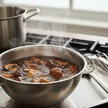 Zacznij od namoczenia grzybów. Umieść suszone borowiki w małej misce. Zalej je około 300 ml wrzącej wody, tak aby były całkowicie przykryte. Przykryj miskę talerzykiem i odstaw na co najmniej 30 minut. Grzyby w tym czasie zmiękną i uwolnią swój głęboki aromat do wody, która będzie bazą sosu.