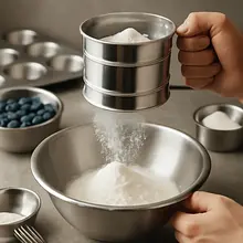 Do dużej miski przesiej 250 g mąki pszennej oraz 15 g proszku do pieczenia przez sitko o oczkach ok. 3–5 mm. Dodaj 150 g cukru i 1 g soli. Przesiewanie napowietrza mąkę i równomiernie rozprowadza proszek do pieczenia — dzięki temu muffinki będą bardziej puszyste.