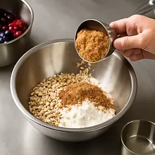 Przygotuj kruszonkę: w średniej misce umieść 60 g płatków owsianych, 50 g brązowego cukru i 40 g mąki pszennej (odłóż z ogólnej ilości mąki 300 g). Drobno pokrój 60 g zimnego masła i dodaj do miski. Rozcieraj palcami lub użyj siekacza do ciasta aż powstaną grudki wielkości kaszy manny i większe kawałki (3-5 mm). Kruszonka powinna być lekko zwarta, ale nie jednolita.