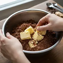 Do miski z suchymi składnikami dodaj 50g zimnego masła, pokrojonego w małą kostkę. Opuszkami palców szybko rozcieraj masło z sypkimi składnikami, aż powstaną grudki przypominające mokry piasek. Staraj się pracować szybko, aby masło się nie rozgrzało. Gotową kruszonkę wstaw do lodówki na czas przygotowywania ciasta.