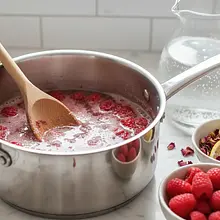 Otrzymany klarowny syrop malinowy odstaw do całkowitego wystudzenia. To bardzo ważne, ponieważ dodanie gorącego syropu do zimnych napojów spowoduje szybkie stopienie lodu i rozcieńczenie lemoniady. Gdy syrop osiągnie temperaturę pokojową, wlej do niego łyżkę wody różanej i delikatnie wymieszaj. Wodę różaną dodajemy na końcu, aby jej delikatny aromat nie ulotnił się podczas gotowania.