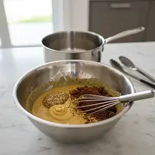 W średniej wielkości misce przygotuj glazurę. Do miski dodaj musztardę Dijon, musztardę miodową, brązowy cukier, sos Worcestershire oraz czosnek w proszku. Jeśli lubisz pikantne smaki, to jest moment, aby dodać opcjonalne płatki chili. Za pomocą trzepaczki lub widelca energicznie mieszaj wszystkie składniki przez około minutę, aż cukier całkowicie się rozpuści, a sos stanie się gładki i jednolity.