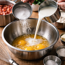 Do roztrzepanych jajek dodaj 20 g cukru (część całego cukru) i 2 g soli. Wlej około 150 ml mleka (z 400 ml) i wymieszaj trzepaczką, aż masa będzie jednolita i bez grudek. Następnie wlej mokre składniki do miski z mąką, tworząc w środku wgłębienie. Mieszaj trzepaczką lub rózgą od środka ku brzegom, stopniowo wlewając pozostałe mleko, aż otrzymasz gładkie, płynne ciasto o konsystencji gęstej śmietany (spływającej w szerokim strumieniu).