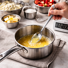 Roztop 30 g masła w małym rondelku lub w mikrofalówce i odstaw na 1–2 minuty, aby lekko przestygło. Wlej roztopione, przestudzone masło do ciasta i energicznie wymieszaj — dzięki temu naleśniki nie przywierają i mają przyjemny maślany aromat. Ciasto powinno być gładkie i lekko lejące; jeśli jest zbyt gęste, dodaj 1–2 łyżki mleka (15–30 ml).