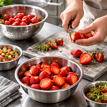 Przygotuj sos truskawkowo-rabarbarowy: umyj i odszypułkuj truskawki (300 g), pokrój większe na połówki. Oczyść rabarbar (200 g) i pokrój na kawałki ok. 1–2 cm. Włóż owoce do rondla o średnicy 18–20 cm, dodaj 30 g cukru (pozostała część cukru z całkowitej ilości) i ustaw na średnim ogniu. Mieszaj co chwilę i doprowadź do delikatnego wrzenia, następnie zmniejsz ogień i gotuj 5–7 minut, aż rabarbar zmięknie, a truskawki puszczą sok. Sos powinien być lekko gęsty — sprawdzisz to, zanurzając łyżkę: sos pokrywa łyżkę bez natychmiastowego spływania.