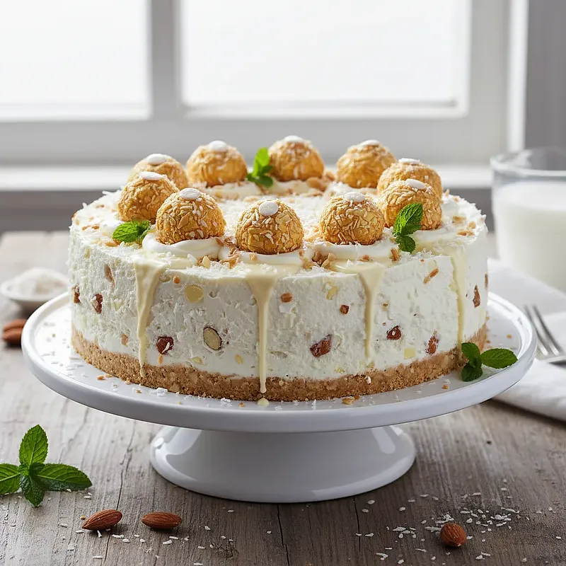 Pralinki Raffaello, które były inspiracją dla tego deseru, zostały wprowadzone przez firmę Ferrero w 1990 roku. W przeciwieństwie do wielu innych produktów tej firmy, nie zawierają czekolady kakaowej, a ich sercem jest cały migdał zanurzony w mlecznym kremie.