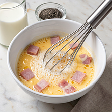 Delikatny, puszysty omlet z szynką i serem żółtym to klasyczne polskie śniadanie przygotowywane w kilka minut. Jajka ubija się z odrobiną mleka, dzięki czemu omlet jest bardziej kremowy, a dodatek szynki i stopionego sera nadaje mu wyrazisty, ale nie przytłaczający smak. Danie jest aromatyczne, ma złocistą, lekko chrupiącą skórkę z zewnątrz i miękki, kremowy środek. Świetnie smakuje z kromką chrupiącego chleba żytniego, świeżymi pomidorami lub zielonymi warzywami wiosennymi. To szybkie, sycące i uniwersalne danie — można je dowolnie wzbogacać ziołami lub sezonowymi dodatkami.