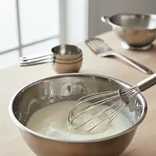 Do idealnie czystej i suchej miski (najlepiej szklanej lub metalowej) wlej białka. Zacznij ubijać je mikserem na średnich obrotach. Gdy białka zaczną się pienić i staną się białe, zwiększ obroty miksera na maksymalne. Ubijaj, aż piana stanie się gęsta i sztywna – po wyjęciu mieszadeł miksera powinny na niej pozostać wyraźne, nieopadające wierzchołki (tzw. 'sztywne szczyty').