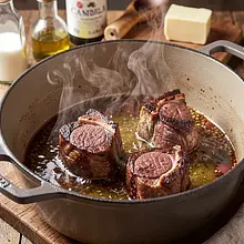 W dużym, ciężkim garnku z grubym dnem (rondel lub brytfanna) rozgrzej olej rzepakowy na wysokim ogniu aż zacznie lekko dymić. Dodaj łyżkę masła. Smaż goleń partiami po 4-5 minut z każdej strony, aż powstanie głęboko brązowa skorupka. Nie ruszaj mięsa zbyt często — pozwól mu się dobrze zrumienić.