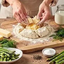Delikatne, chrupiące paluszki serowe z dodatkiem młodych szparagów i aromatycznego kopru — kaszubska wariacja na temat klasycznej przekąski, dostosowana do wiosennego sezonu. Ciasto jest maślane i serowe, z drobnymi kawałkami blanszowanych szparagów i świeżego koperku, co daje przyjemny kontrast tekstur: kruche na zewnątrz, lekko wilgotne w środku. Idealne jako przekąska dla dzieci (poręczne, łatwe do trzymania), sprawdzą się też na przyjęciach, piknikach i do koszyka z regionalnymi dodatkami. Podawać z kwaśną śmietaną wymieszaną z koperkiem lub jako dodatek do chłodnika ze szczawiem — mają przyjemny, lekko słony smak i złocistą skórkę.