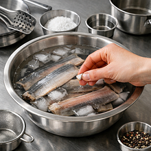 Użyj dużej, płytkiej miski lub naczynia żaroodpornego. Jeśli masz więcej czasu, mocz 2 godziny dla łagodniejszego smaku. Zimna woda jest kluczowa — gorąca przyspieszy rozpad mięsa.