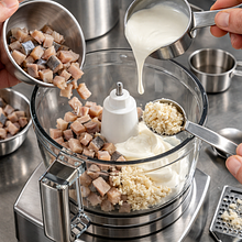 Do kielicha blendera lub malaksera włóż pokrojone filety śledziowe, chrzan i śmietanę. Dodaj sok z połowy cytryny (ok. 10–15 g soku) — wyciśnij cytrynę ręcznie nad małą miseczką, aby nie trafiły pestki. Jeśli używasz masła, pokrój je na kawałki i dodaj teraz (masło powinno być miękkie). Pulsuj blenderem kilkukrotnie (seria 6–8 pulsów po 1–2 sekundy), aż składniki się połączą, ale zachowają lekko grudkowatą strukturę; jeśli chcesz bardzo gładką pastę, miksuj 20–30 sekund ciągłym pulsem. Jeśli nie masz blendera, bardzo drobno posiekaj wszystkie składniki nożem, a następnie energicznie wymieszaj łyżką lub tłuczkiem do ziemniaków przez 3–5 minut, aż powstanie jednolita masa.