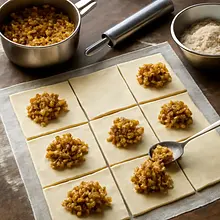 Rozłóż na stolnicy ciasto francuskie i pokrój na prostokąty. Nałóż na każdy kawałek łyżkę nadzienia i zawiń w formę pasztecików.
