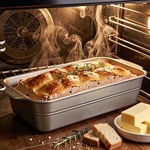 Nagrzej piekarnik do 180°C (góra-dół). Natłuść keksówkę o długości 25 cm masłem i wyłóż papierem do pieczenia tak, aby ścianki były zabezpieczone. Przełóż masę do formy i wyrównaj wierzch łyżką. Możesz posypać wierzch odrobiną bułki tartej lub małą ilością masła dla złocistej skórki. Wstaw formę do nagrzanego piekarnika na środkową półkę i piecz 35-45 minut. Pasztet jest gotowy, gdy wierzch jest złocisty, a wbita wykałaczka wychodzi sucha lub środek osiągnie temperaturę około 75°C.