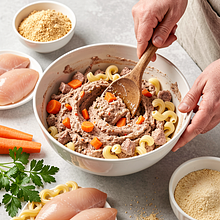 Nowoczesna wersja pasztetu inspirowana polską kuchnią: delikatne mięso z piersi kurczaka połączone z ugotowanym makaronem i wiosennymi warzywami, doprawione natką pietruszki i tymiankiem, zapieczone na złocisto w formie pasztetu. Danie łączy teksturę kremowego mięsa i jędrnego makaronu z lekko słodkową marchewką i aromatem czosnku; świetne jako przystawka na przyjęcie lub elegancka przekąska na kanapkę. Pasztet podajemy pokrojony w plastry, można go serwować na ciepło lub na zimno z majonezem ziołowym, kiszonym ogórkiem lub świeżymi ziołami. Estetyka: zwarta forma, przekrój ukazujący warstwy makaronu i warzyw, złocista skórka. Walory smakowe: umami z mięsa, słodycz warzyw, świeżość natki pietruszki i lekka kwaśność dodatków.