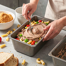 Wstaw formę do nagrzanego piekarnika na środkową półkę. Piecz 40-45 minut w 180°C. Po 30 minutach możesz przykryć pasztet folią aluminiową jeśli wierzch zaczyna się zbyt szybko rumienić. Pasztet jest gotowy, gdy jego środek osiągnie temperaturę ~75°C (możesz użyć termometru kuchennego) lub gdy wbity patyczek wychodzi czysty (bez surowej wilgotnej masy).