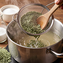 Odważ 200 g soczewicy zielonej. Wsyp soczewicę do sitka i przepłucz pod zimną wodą, potrząsając, aż woda będzie klarowna. Umieść soczewicę w garnku z 600 ml zimnej wody (stosunek 1:3) i niewielką szczyptą soli. Doprowadź do wrzenia na dużym ogniu, zmniejsz ogień do małego i gotuj 20–25 minut bez przykrycia, aż ziarna będą miękkie, ale nie rozpadające się (powinny zachować kształt).