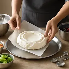 Na odrysowanym kole na papierze do pieczenia ułóż masę białkową: połóż na środku dużą łyżkę piany, rozprowadź ją ku brzegom tak, aby powstał lekko podniesiony brzeg i nieco wgłębione centrum (to miejsce na krem i owoce). Wyrównaj wierzch tak, aby brzegi były ładnie pofałdowane — to doda dekoracyjnego wyglądu po upieczeniu.
