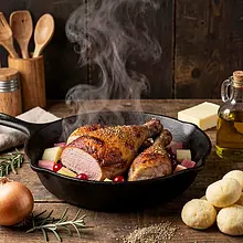 Do naczynia z mięsem dodaj pokrojony rabarbar (300 g) oraz żurawinę (80 g). Wlej bulion drobiowy (500 ml). Przykryj naczynie pokrywką lub szczelnie folią aluminiową i wstaw do nagrzanego piekarnika. Piecz 60 minut. Po 60 minutach sprawdź miękkość: wbij widelec w największy kawałek – powinien wchodzić bez oporu, a mięso powinno odchodzić od kości. Jeśli jest jeszcze jędrne, piecz dodatkowe 15-20 minut.