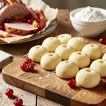 Formuj kluski: nabieraj porcje ciasta wielkości orzecha włoskiego (ok. 30 g) i obtocz w niewielkiej ilości skrobi, uformuj kulkę, następnie wciśnij kciukiem środek, tworząc charakterystyczne zagłębienie. Układaj kluski na oprószonej mąką lub skrobią desce. W dużym garnku zagotuj osoloną wodę i gotuj kluski partiami: włóż delikatnie do wrzącej wody, zagotuj ponownie i gotuj 3-4 minuty od momentu ponownego wypłynięcia na powierzchnię.