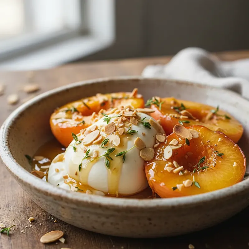 Wyjmij upieczone brzoskwinie z piekarnika. Używając łopatki, ostrożnie rozłóż jeszcze ciepłe połówki wokół rozerwanej burraty na talerzu. Polej całość przygotowanym wcześniej miodem tymiankowym (wyjmij z niego gałązki tymianku lub zostaw dla dekoracji). Posyp obficie uprażonymi płatkami migdałów. Jeśli używasz składników opcjonalnych, teraz jest moment, aby polać danie odrobiną kremu balsamicznego i udekorować świeżymi listkami bazylii. Podawaj natychmiast.