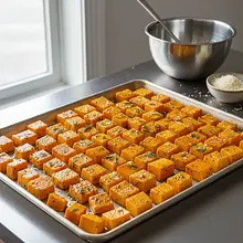 Rozłóż przyprawioną dynię w jednej warstwie na przygotowanej blasze. Wstaw do rozgrzanego piekarnika i piecz przez 20-25 minut. W połowie pieczenia (po około 10-12 minutach) przemieszaj dynię łopatką. Dynia jest gotowa, gdy jest miękka (widelec wchodzi w nią bez oporu) i ma złocisto-brązowe, lekko skarmelizowane brzegi.