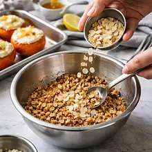 Jeśli wybrałeś płatki migdałowe (opcjonalne), dodaj je teraz do kruszonki i delikatnie wymieszaj. Przesyp kruszonkę na blaszkę wyłożoną papierem do pieczenia i rozłóż równomierną warstwą. Piecz w nagrzanym piekarniku 10–12 minut w środku piekarnika, mieszając lekko co 4 minuty, aby kruszonka równomiernie się zarumieniła. Wyjmij, gdy będzie złocista i sucha — po wystudzeniu stanie się jeszcze bardziej chrupiąca.