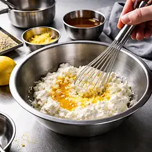 W misce umieść ricottę (250 g). Dodaj miód (15 g — połowę porcji), startą skórkę z cytryny (6 g) oraz szczyptę soli (1 g). Ubijaj szczupłą trzepaczką lub łyżką przez 1–2 minuty, aż masa stanie się gładka i lekko puszysta. Spróbuj kremu: powinien być przyjemnie słodki z wyraźną nutą cytryny; jeśli potrzeba, dosłódź odrobiną pozostałego miodu.