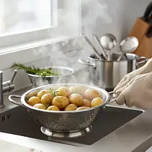 Ostrożnie odcedź ziemniaki na durszlaku. Pozostaw je w durszlaku na 2-3 minuty, aby odparowały i całkowicie wyschły. Następnie, trzymając durszlak obiema rękami, energicznie nim potrząśnij kilka razy. Chodzi o to, aby postrzępić i lekko 'zranić' krawędzie ziemniaków. Te postrzępione brzegi staną się po upieczeniu super chrupiące.