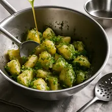 Wrzuć lekko poszarpane, lekko odparowane ziemniaki do miski z oliwą i ziołami. Delikatnie mieszaj silikonową łopatką lub łyżką przez 1-2 minuty, aby każdy kawałek pokrył się równomiernie oliwą i ziołami. Spróbuj jednego kawałka — dopraw dodatkową solą, jeśli potrzeba.