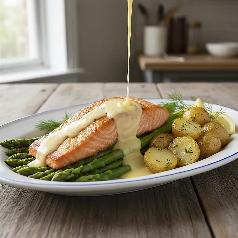 To wykwintne, a zarazem proste w przygotowaniu danie, które w pełni oddaje smak wiosny i wczesnego lata. Soczysty, delikatny filet z łososia, upieczony do perfekcji, spoczywa na chrupiącym 'dywanie' ze świeżych, zielonych szparagów. Całość dopełniają ugotowane w mundurkach młode ziemniaczki o maślanym smaku oraz aksamitny, kremowy sos holenderski – klasyk kuchni francuskiej. Sos, z jego bogatym, maślanym smakiem i subtelną nutą cytrynowej kwasowości, idealnie komponuje się zarówno z rybą, jak i warzywami. Danie jest nie tylko ucztą dla podniebienia, ale również dla oczu – kontrastujące kolory różowego łososia, intensywnej zieleni szparagów i jasnożółtego sosu tworzą apetyczną kompozycję na talerzu. Idealne na elegancki obiad, romantyczną kolację czy specjalną okazję, gdy chcesz zaimponować gościom bez spędzania całego dnia w kuchni.