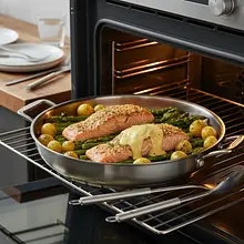 W międzyczasie, gdy ziemniaki się gotują, przygotuj łososia i szparagi. Rozgrzej piekarnik do 200°C (tryb góra-dół). Umyj szparagi pod zimną wodą. Aby przygotować je do pieczenia, musisz odłamać zdrewniałe końcówki. Złap każdą łodygę obiema rękami - jedną ręką przy podstawie, drugą w połowie długości - i delikatnie zegnij. Szparag naturalnie złamie się w miejscu, gdzie kończy się twarda, włóknista część. Wyrzuć końcówki. Filety z łososia opłucz i osusz ręcznikiem papierowym - to kluczowe dla uzyskania chrupiącej skórki.