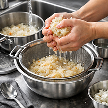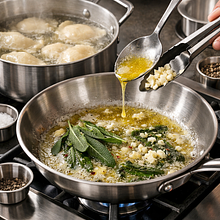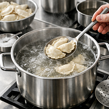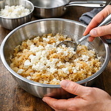 Przygotuj stolnicę lub dużą miskę. Przesiej 500 g mąki pszennej na stolnicę, zrób na środku szerokie wgłębienie. W małej misce roztrzep 120 g jajek (2 szt.) z 5 g soli. Podgrzej 200 ml wody do temperatury około 35-40°C — powinna być przyjemnie ciepła, nie gorąca. Wlej do wgłębienia najpierw jajka, następnie stopniowo dolewaj ciepłą wodę, mieszając mąkę widelcem od środka, aż powstanie gęsta masa.