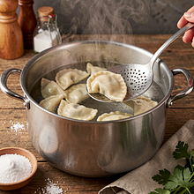 Przesiej mąkę do dużej miski (najlepiej o pojemności 4 l), zrób w środku szerokie wgłębienie. Dodaj sól (5 g) na brzeg mąki, a do wgłębienia wbij jajka (120 g). W oddzielnym kieliszku wymieszaj wodę (120 ml) — powinna być letnia (ok. 20–25°C). Wlej połowę wody do jajek i mieszaj widelcem tylko środkową część, ściągając mąkę z brzegów, aż powstanie gęsta, grudkowata masa.