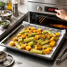 Rozgrzej piekarnik do 200°C (góra-dół). Na blasze wyłożonej papierem do pieczenia rozłóż kawałki selera i dyni, skrop 15 g oliwy z oliwek, lekko posól (ok. 2 g z soli podanej) i wymieszaj ręcznie. Piecz przez około 35-45 minut, aż warzywa będą miękkie — sprawdzisz to, wbijając nóż: powinien łatwo wchodzić w środek.