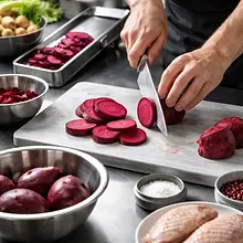 Wyjmij piersi kaczki z lodówki 30 minut przed gotowaniem, aby osiągnęły temperaturę pokojową (pozwoli to na równomierne smażenie). Opłucz buraki, osusz papierowym ręcznikiem. Obierz seler i pokrój na równe kawałki około 2-3 cm, aby równomiernie się ugotował. Oddziel ziarna granatu od łupin: przeciąć granat na pół i uderzyć łyżką o skórę nad miską, aż ziarna wypadną. Pokrój czerwoną cebulę w cienkie półplasterki.