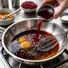 Na średniej patelni połącz 100 ml soku z granatu, 30 g miodu, 30 ml octu balsamicznego, 1 drobno posiekany ząbek czosnku i 2 gałązki tymianku. Gotuj na średnim ogniu 12-15 minut aż objętość zmniejszy się o połowę, mieszając od czasu do czasu — masa powinna zgęstnieć do konsystencji syropu (nieco lepka, pokrywa łyżkę). Spróbuj i dopasuj słodycz/kwasowość: jeśli za kwaśne, dodaj trochę miodu; jeśli za słodkie, dodaj odrobinę octu. Po zdjęciu z ognia usuń gałązki tymianku.