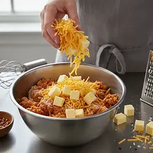 Dodaj zimne masło i ser. Wyjmij masło prosto z lodówki i pokrój je w małą kostkę (ok. 1x1 cm). Wrzuć kostki masła do miski z mąką. Teraz, używając opuszków palców, szybko rozcieraj masło z mąką, aż mieszanina zacznie przypominać mokry piasek lub kruszonkę z widocznymi małymi grudkami masła. Następnie dodaj starty na drobnych oczkach ser Cheddar i krótko wymieszaj, aby połączył się z resztą składników.