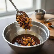W dużej misce, wystarczająco pojemnej, by pomieścić wszystkie orzechy, połącz płynne składniki. Wlej oliwę z oliwek oraz syrop klonowy. Używając małej trzepaczki lub widelca, energicznie mieszaj przez około 30 sekund, aż płyny połączą się w jednolitą, lekko zgęstniałą emulsję. To zapewni równomierne pokrycie orzechów.