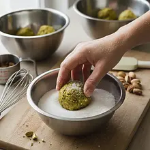 Odkryj magię pistacjowych ciasteczek 'crinkle', które zachwycają nie tylko smakiem, ale i wyglądem. Każde ciasteczko to małe dzieło sztuki: intensywnie zielone wnętrze, otulone śnieżnobiałą, popękaną skorupką z cukru pudru, przypominającą spękaną ziemię. W smaku są idealnie zbalansowane – głęboka, orzechowa nuta prawdziwych pistacji jest wzbogacona subtelnym aromatem migdałowym, który dodaje im elegancji. Konsystencja jest wprost uzależniająca: delikatnie chrupiące na zewnątrz, a w środku cudownie miękkie i ciągnące. Te ciasteczka są idealnym dodatkiem do popołudniowej kawy, eleganckim poczęstunkiem na specjalne okazje, takie jak święta czy przyjęcia, a także wspaniałym pomysłem na jadalny prezent, który z pewnością zrobi wrażenie na obdarowanych. Ich przygotowanie to czysta przyjemność, a efekt końcowy jest spektakularny.