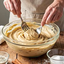 Rozgnieć banany. Umieść banany w szerokiej misce i rozgnieć widelcem lub tłuczkiem na jednolitą masę z drobnymi kawałkami (powinna przypominać gęste puree). Dodaj jajka (120 g) bezpośrednio do banana i energicznie wymieszaj widelcem lub trzepaczką, aż masa stanie się jednolita i lekko pienista. Dodaj mąkę i sól (oraz cynamon jeśli używasz) i wymieszaj tylko do połączenia — ciasto powinno mieć konsystencję gęstego jogurtu; jeśli jest za rzadkie, można dodać łyżeczkę mąki więcej.